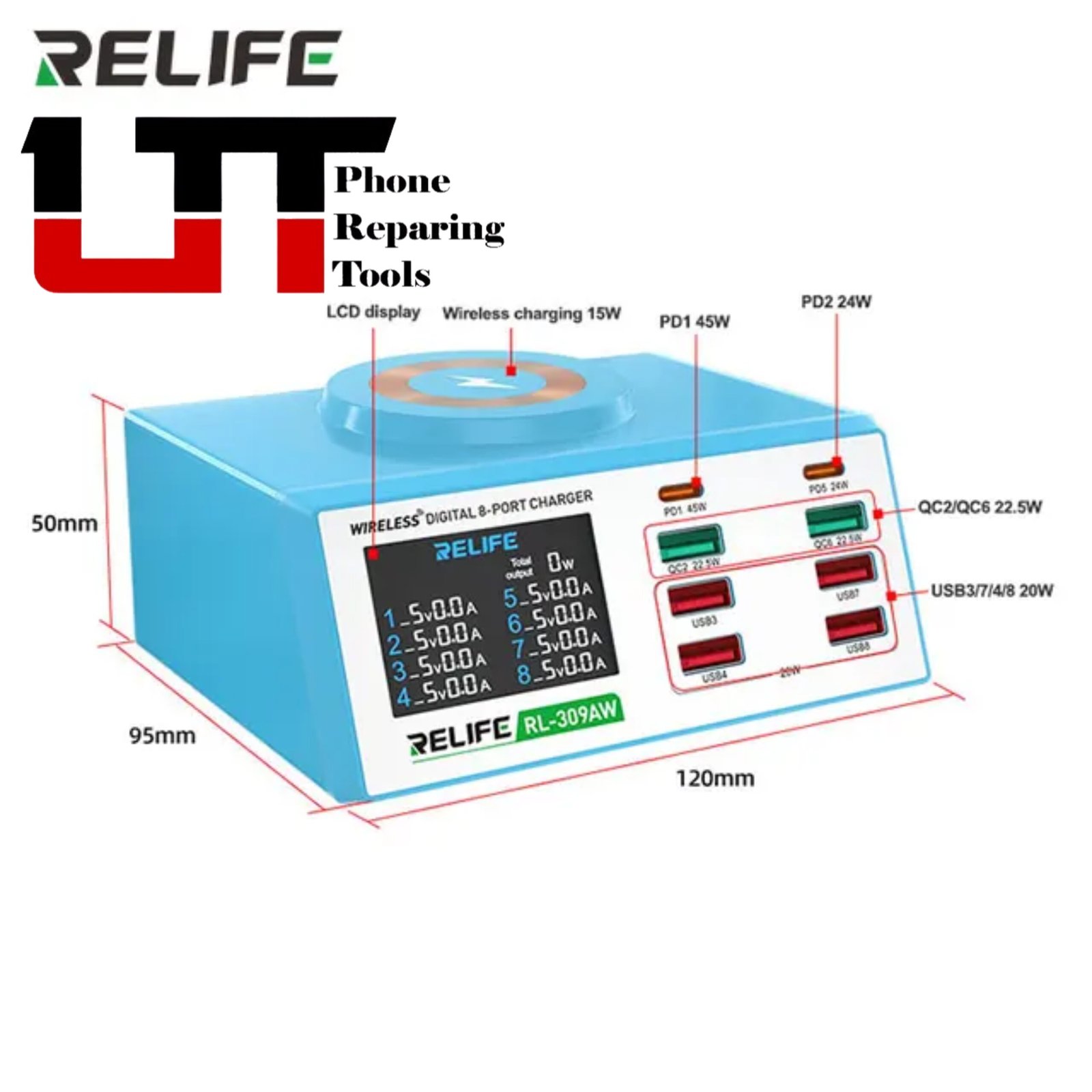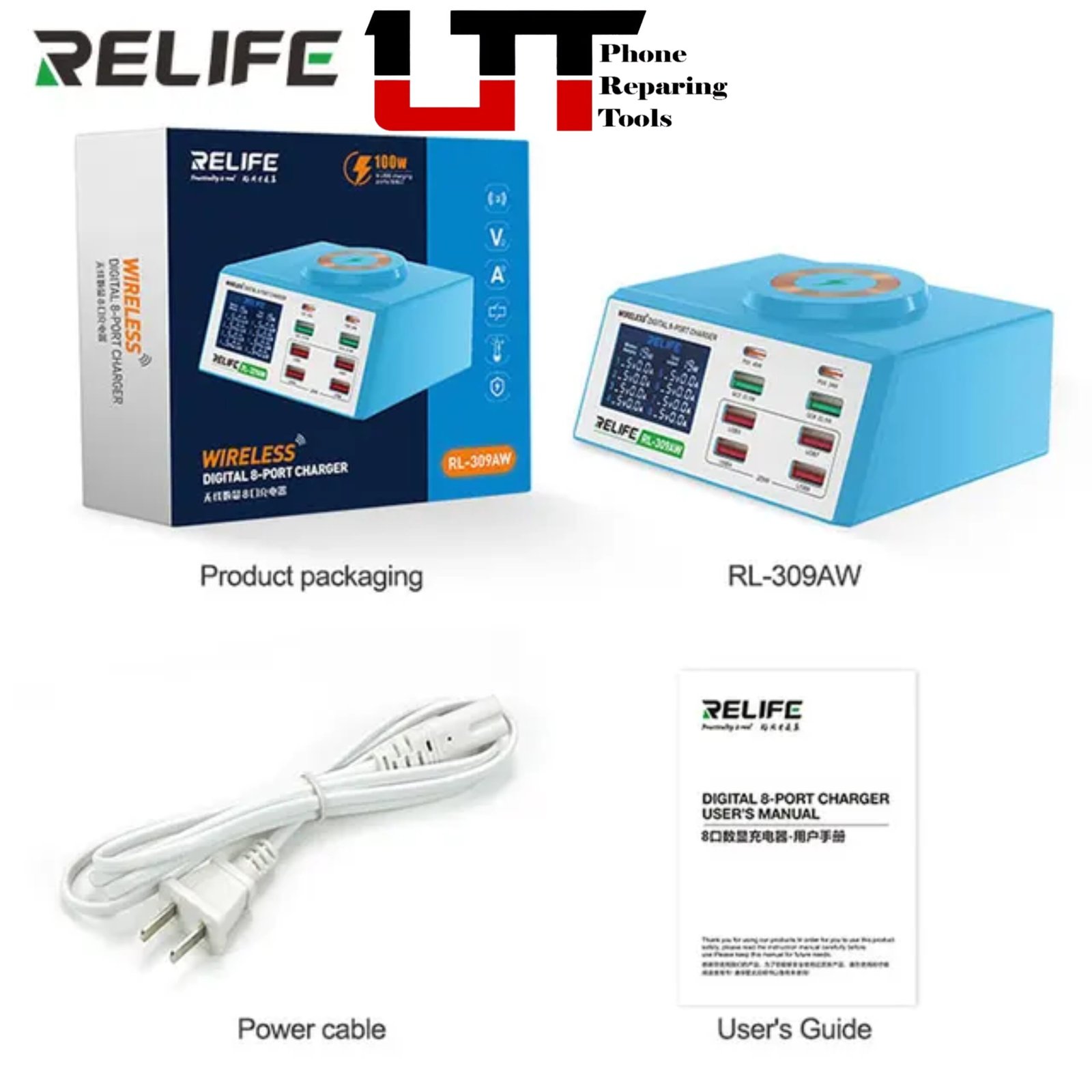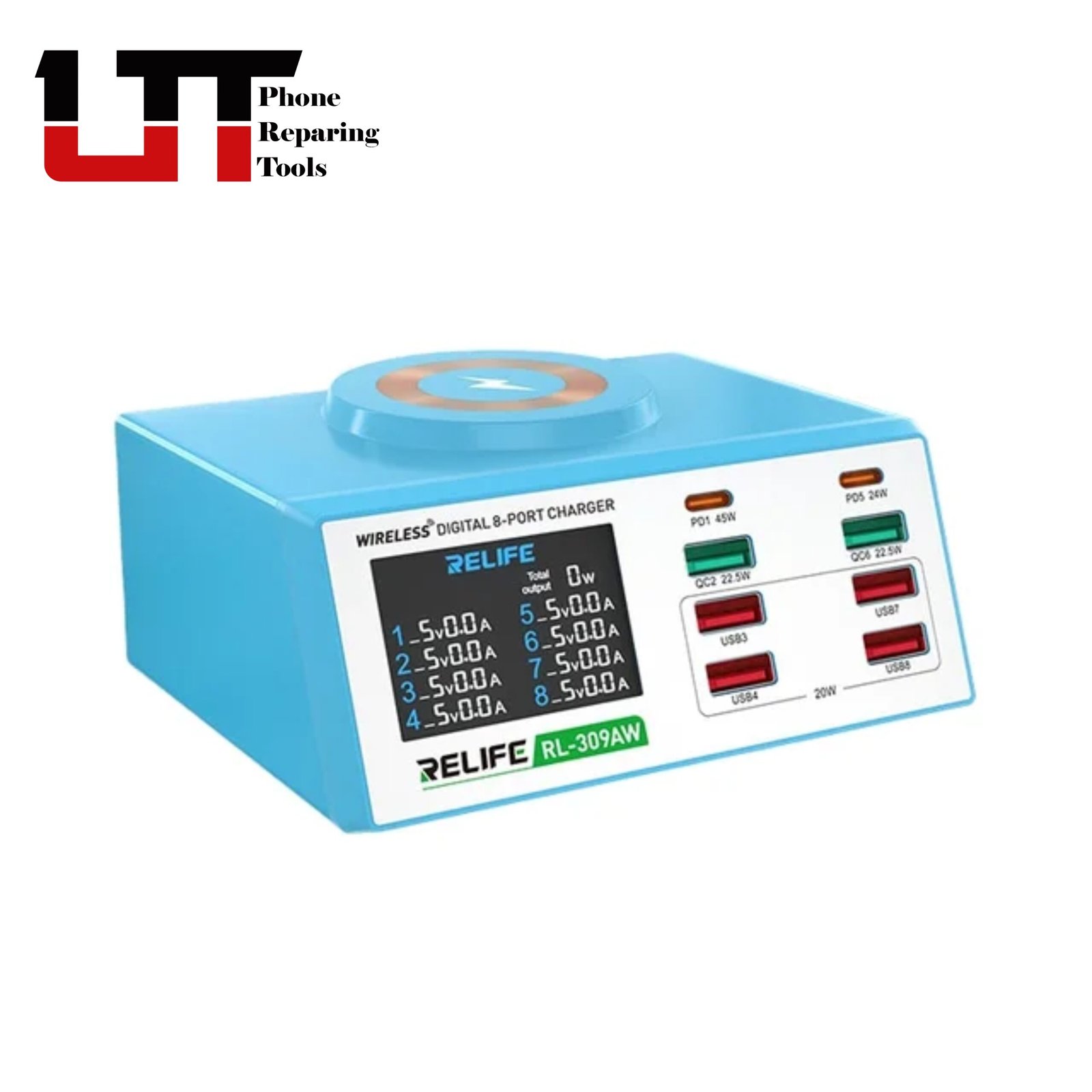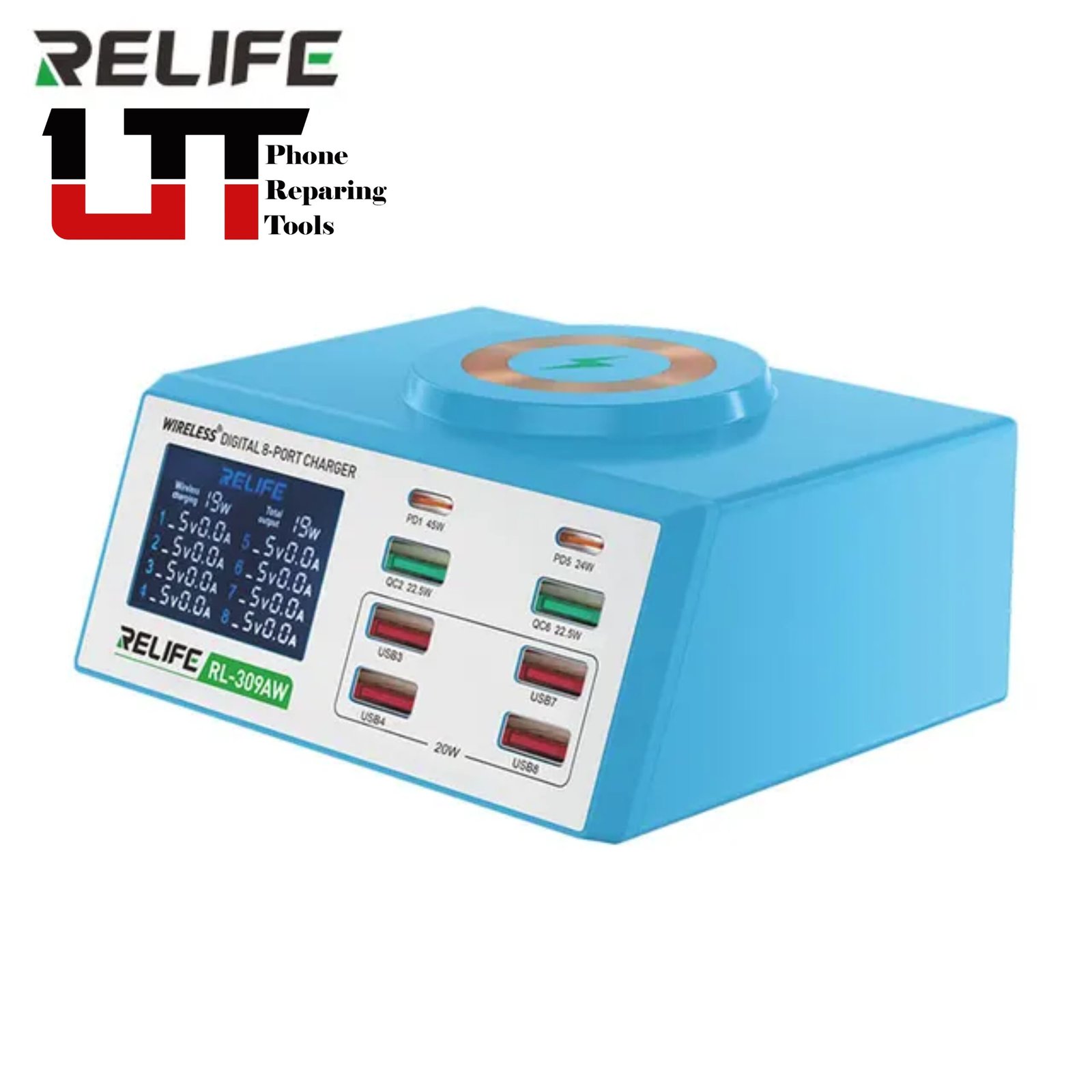RELIFE RL-309AW Multifunction 8-port Charger for Mobile Phone with Short Circuit Repair Function Smart Wireless Fast Charging